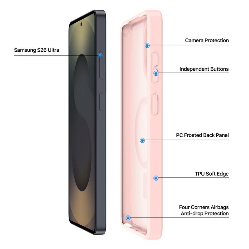Protejați-vă Samsung Galaxy S26 Ultra cu o husă mată elegantă care se fixează direct pe încărcătoarele și accesoriile MagSafe. Seria Yind combină o placă din spate PC rezistentă la zgârieturi cu margini TPU care absorb șocurile și un inel magnetic aliniat cu precizie, oferind alimentare fără cablu și protecție completă împotriva căderilor, fără buzunare voluminoase.