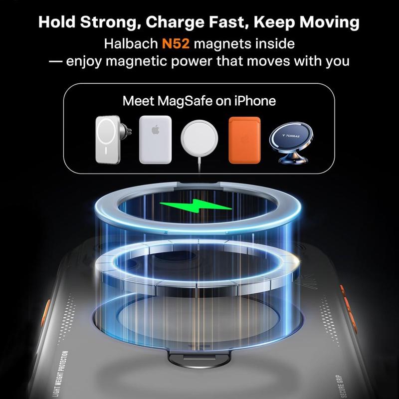 Dispunând de tehnologia Halbach Array cu magneți de neodim premium N52SH, carcasa oferă o forță magnetică cu până la 200% mai puternică. Acest lucru asigură atașarea și încărcarea fiabilă cu toate accesoriile MagSafe.