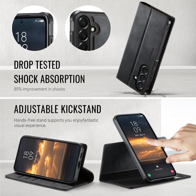Carcasa de portofel CaseMe C49 pentru Samsung Galaxy A57 este fabricată din TPU durabil și poliuretan, oferind o prindere confortabilă și protecție fiabilă împotriva șocurilor, căderilor și zgârieturilor de zi cu zi. În interior, o căptușeală moale din microfibră asigură că dispozitivul dvs. rămâne impecabil.