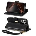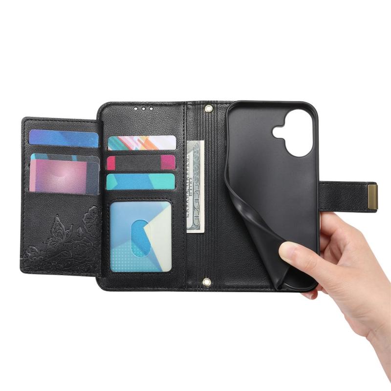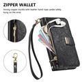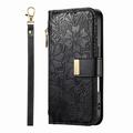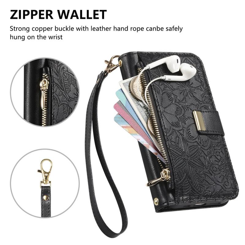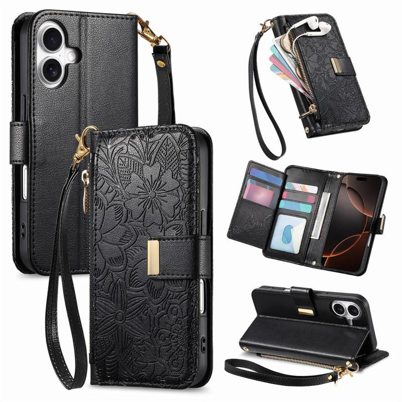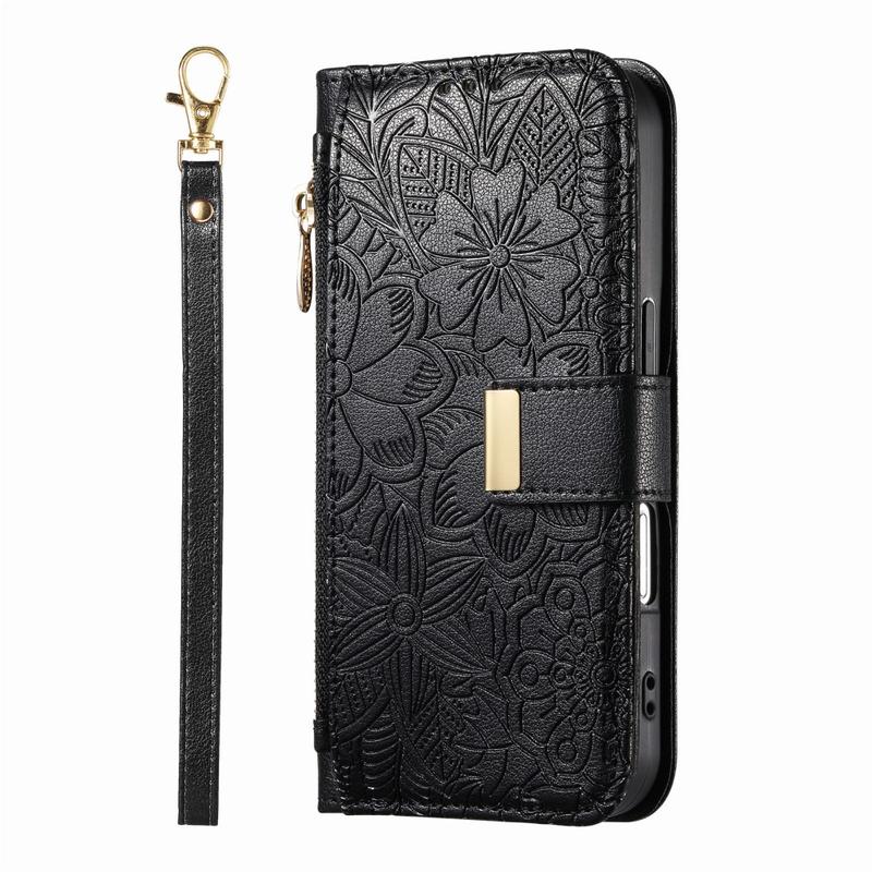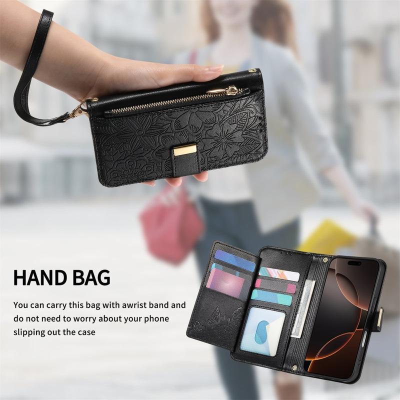 Husă portofel cu model floral și frunze, buzunar cu fermoar și curea de mână pentru iPhone 17