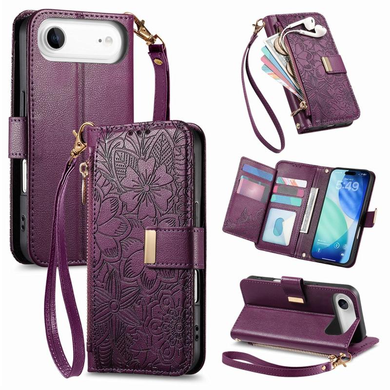 Husă portofel cu model floral și frunze, buzunar cu fermoar și curea de mână pentru iPhone Air