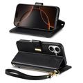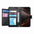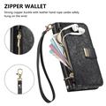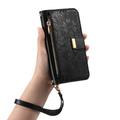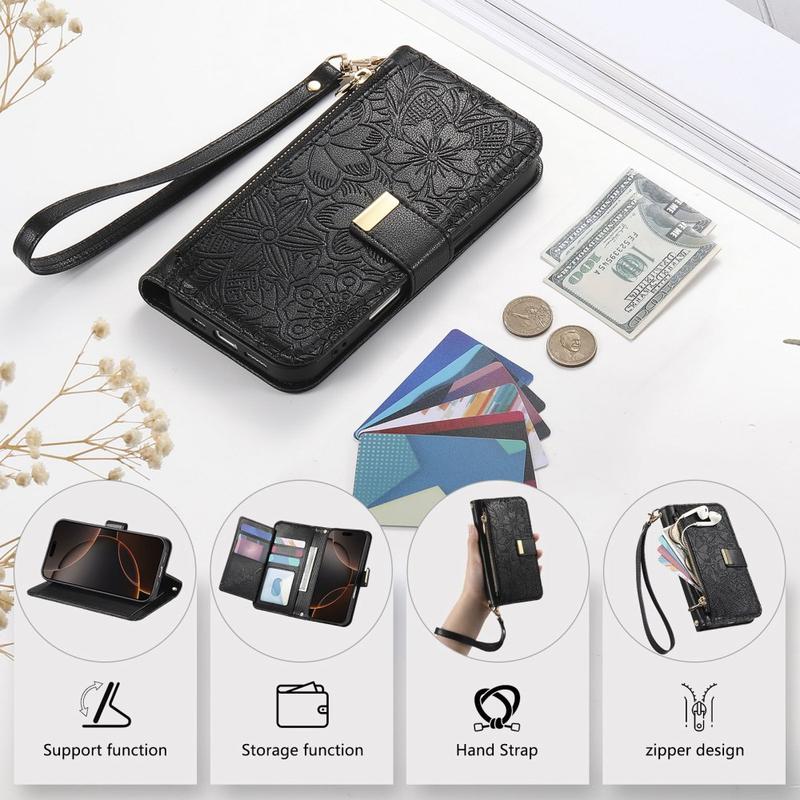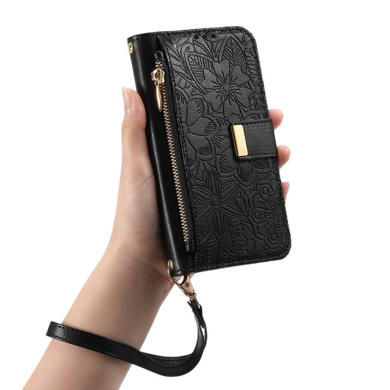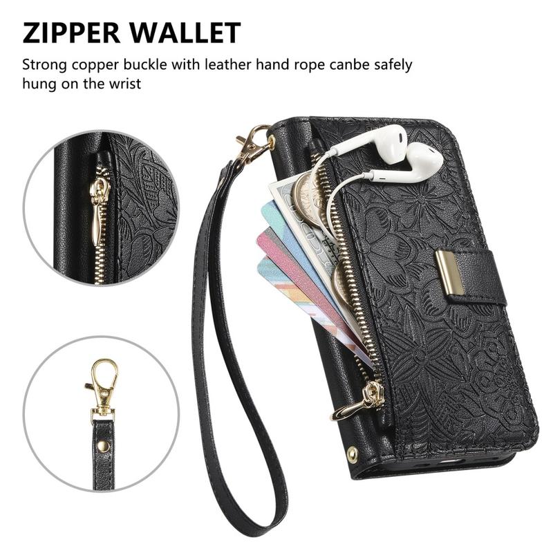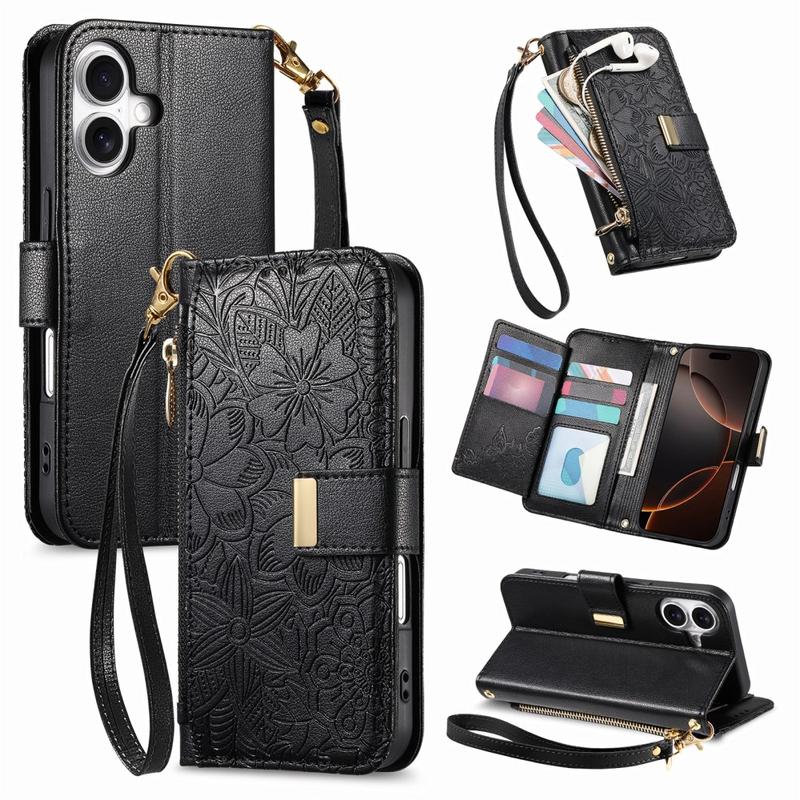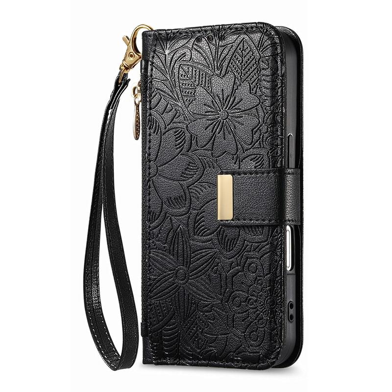 Husă portofel cu model floral și frunze, buzunar cu fermoar și curea de mână pentru iPhone 16