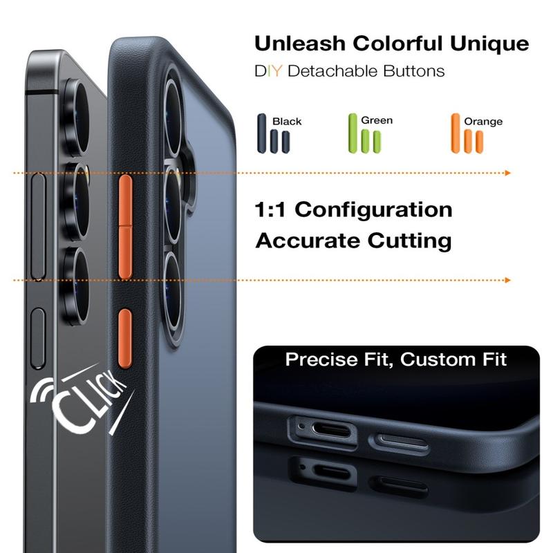 Carcasa include trei seturi de culori de butoane interschimbabile, permițându-vă să personalizați aspectul Samsung Galaxy S26. Schimbați cu ușurință butoanele pentru a se potrivi stilului, ținutei sau dispoziției dvs. și creați un aspect unic, personalizat.