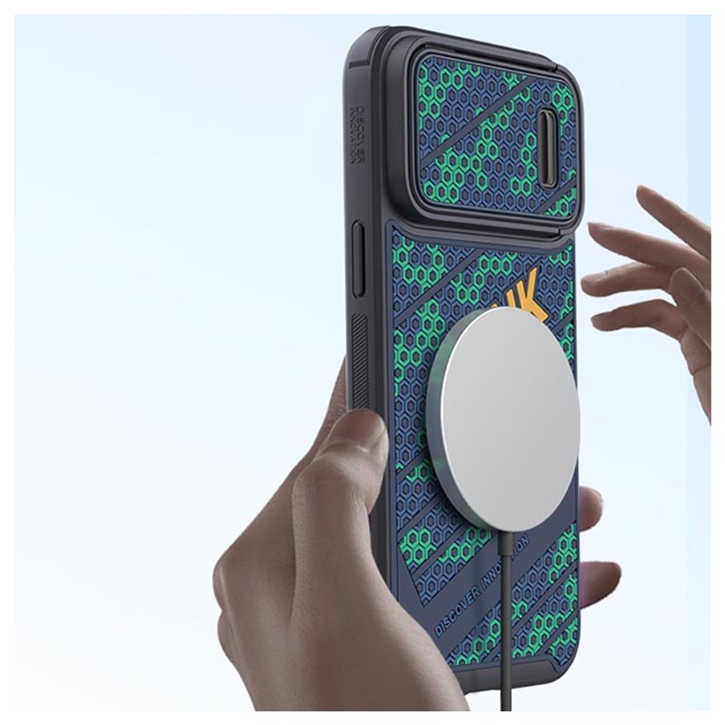 Această carcasă cu două straturi, cu un design unic de tip fagure 3D, este realizată din material TPU flexibil, care absoarbe șocurile și plastic dur, cu o folie magnetică încorporată compatibilă cu accesoriile Apple MagSafe. Apoi, carcasa are un glisor pentru cameră care protejează complet camera de pe iPhone 14 Pro.