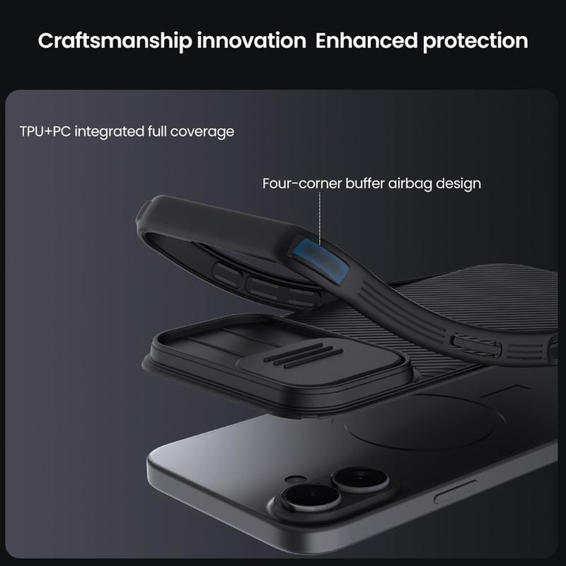 Bucurați-vă de confidențialitate și protecție suplimentară cu carcasa hibridă Nillkin CamShield Pro. Combinând plasticul rigid și TPU, capacul camerei previne zgârieturile, protejând în același timp iPhone 17 de uzura zilnică.