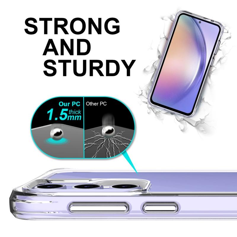 Această husă este creată dintr-o combinație de acril și TPU, pentru a păstra telefonul în stare impecabilă. În același timp, colțurile consolidate, care absorb șocurile, împiedică deteriorarea, iar designul transparent scoate în evidență minunatul design al telefonului Samsung Galaxy A35.