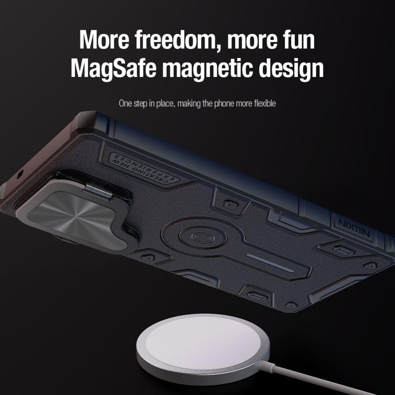 Nillkin CamShield Armor Prop Case este perfectă pentru cei care doresc protecție maximă pentru Samsung Galaxy S25 Ultra, menținând în același timp o funcționalitate elegantă. Capacul pentru obiectivul camerei asigură că obiectivele dvs. rămân imaculate, în timp ce kickstand-ul încorporat și compatibilitatea MagSafe oferă un plus de confort.