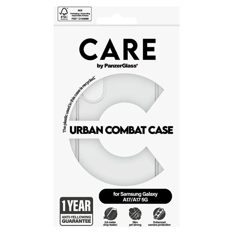 Carcasa emblematică CARE by PanzerGlass pentru Samsung Galaxy A17, Galaxy M17 Urban Combat cu ramă transparentă este concepută pentru cei care au nevoie de protecție robustă fără a sacrifica stilul. Fabricată din plastic 100% reciclat, această carcasă este construită pentru a rezista la căderi de până la 4,8 metri și oferă rezistență sporită la zgârieturi și șocuri. De asemenea, este compatibilă cu încărcarea wireless și vine cu o garanție de 1 an împotriva îngălbenirii.