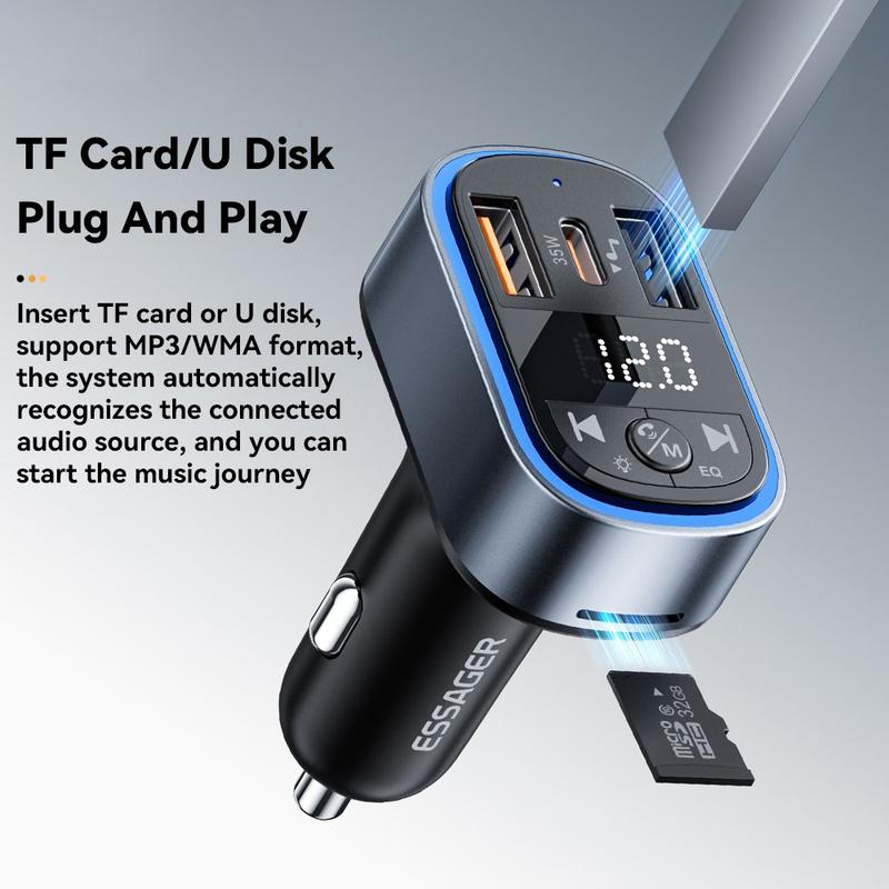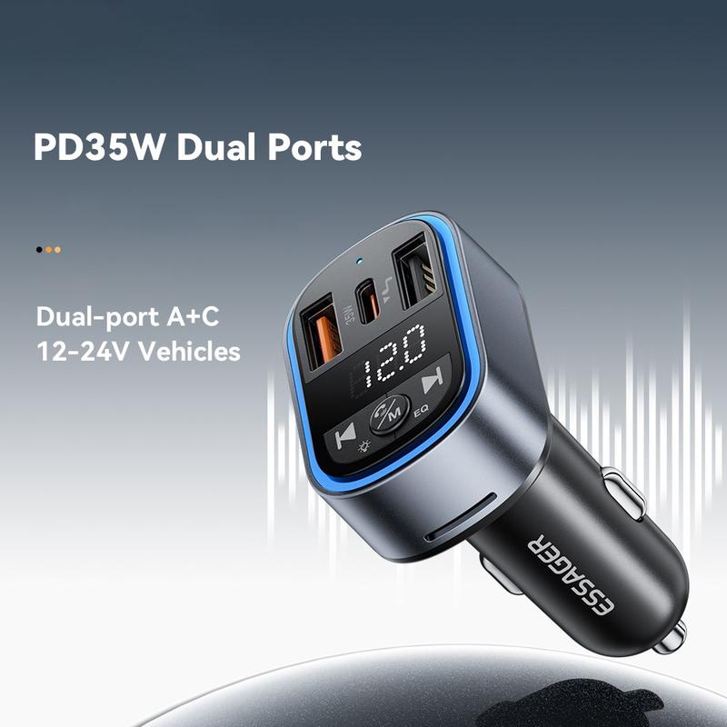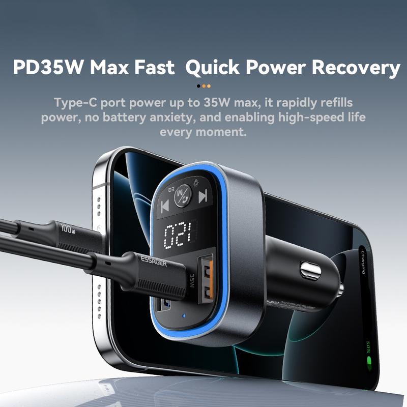 Essager ECCFM-CT0G-P Încărcător auto cu încărcare rapidă 35W PD cu port dublu USB-C/USB-A, transmițător FM Bluetooth 5.3, microfon HD pentru apeluri