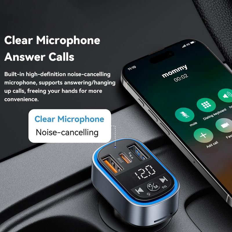 Transmițătorul FM integrat (87.5-108MHz) permite împerecherea ușoară cu radioul FM al mașinii. Pur și simplu selectați o frecvență clară și bucurați-vă de muzica preferată, podcasturi sau navigație audio prin difuzoarele mașinii.