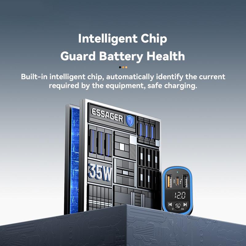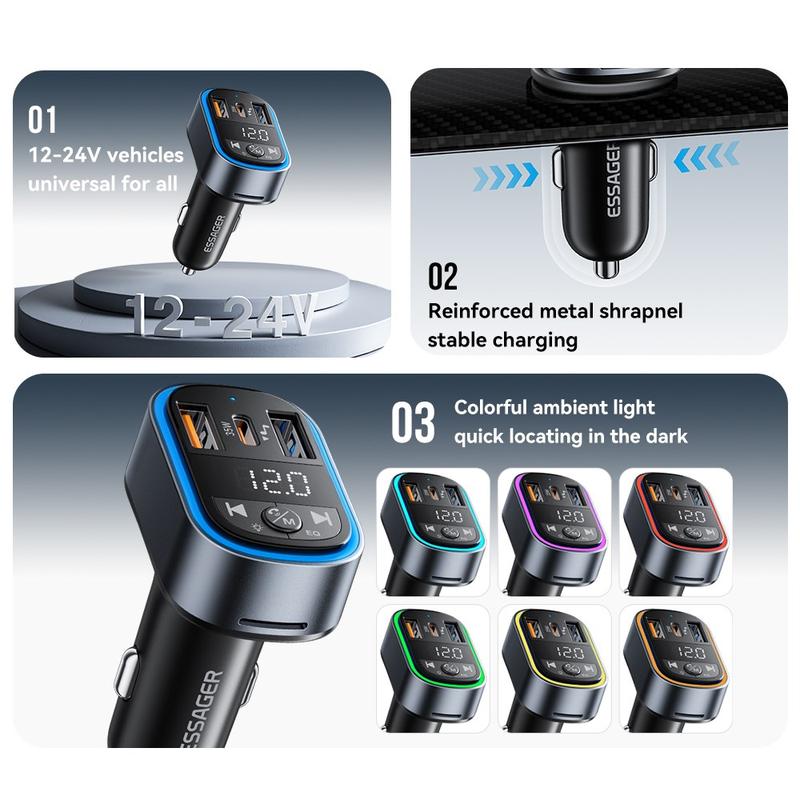 ESSAGER ECCFM-CT0G-P combină încărcarea rapidă, streaming wireless Bluetooth 5.3, un transmițător FM, apelare hands-free HD și suport pentru redarea media - toate într-un singur accesoriu auto compact și elegant. Un upgrade perfect pentru un condus mai sigur și divertisment îmbunătățit în mașină.