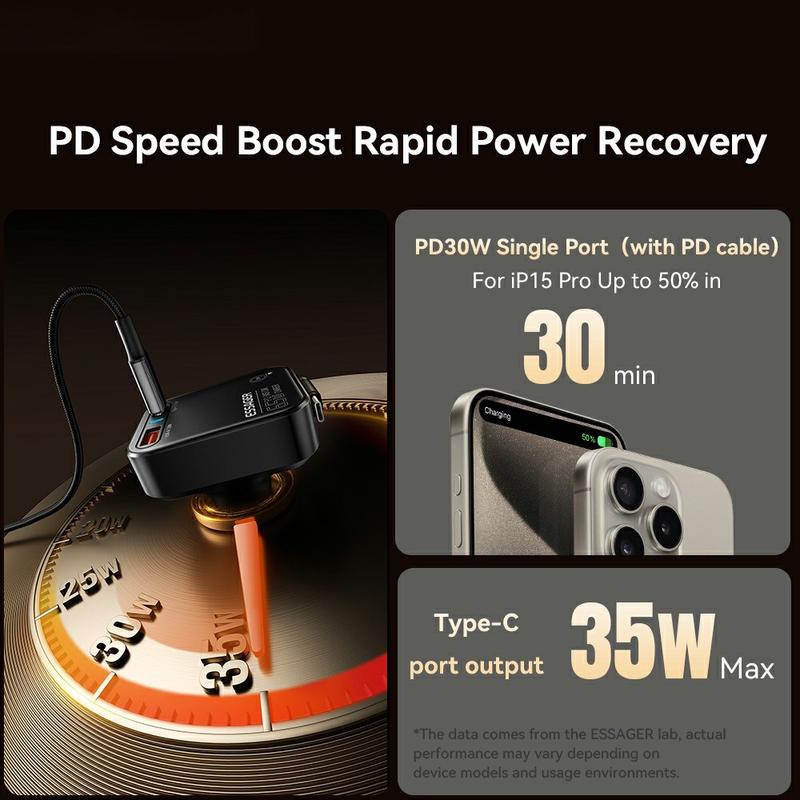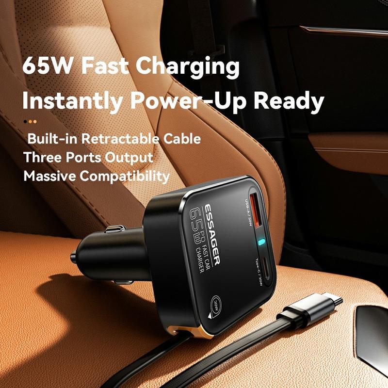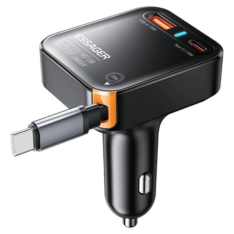 Încărcător auto rapid Essager 65W cu cablu USB-C retractabil - porturi USB-A și Type-C, distribuție inteligentă a energiei