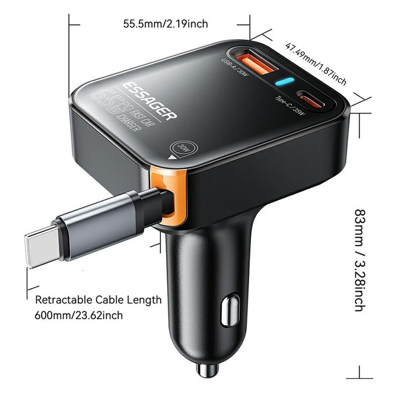 Încărcătorul rapid ESSAGER 65W combină funcționalitatea cu un design atent. Cablul său retractabil vă menține mașina ordonată, în timp ce sistemul inteligent de gestionare a energiei asigură încărcarea rapidă și sigură a dispozitivelor dvs. de fiecare dată. Compact, durabil și elegant - este un must-have pentru oricine este în mișcare.