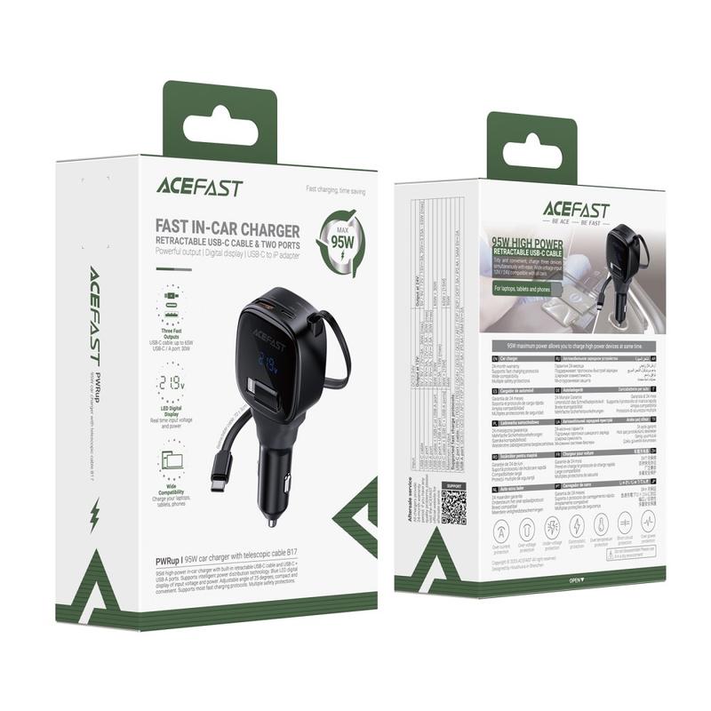 ACEFAST B17 combină performanța, caracterul practic și designul premium într-un singur accesoriu compact. Cablul său retractabil elimină dezordinea, afișajul LED îmbunătățește conștientizarea încărcării, iar puterea puternică de 95 W combinată asigură o încărcare rapidă și fiabilă pentru o gamă largă de dispozitive. Fie că faceți naveta sau călătoriți, este un upgrade de mare valoare pentru orice șofer.