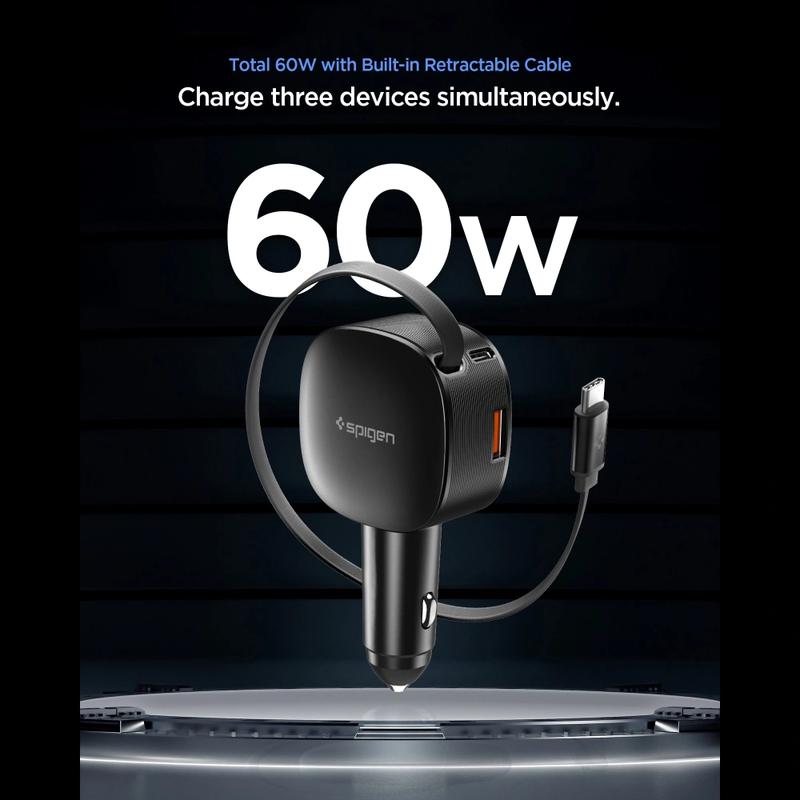 Încărcător auto Spigen EV603BT Essential - încărcare rapidă de 60 W cu cablu USB-C retractabil și porturi USB-C, USB-A