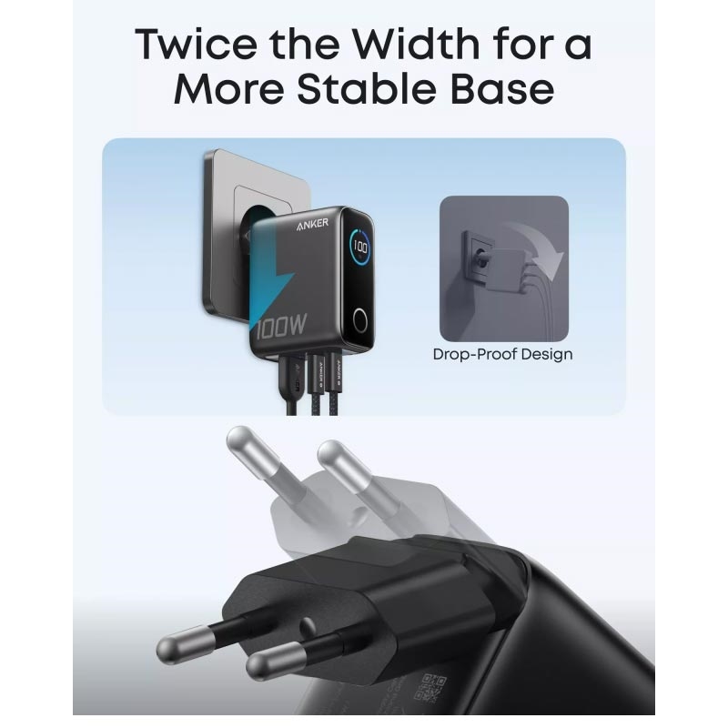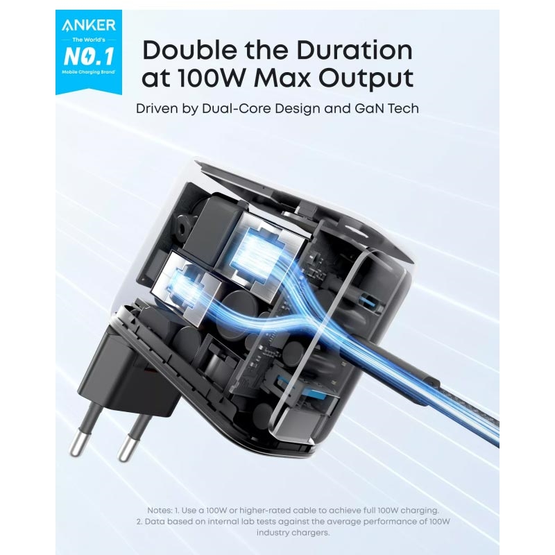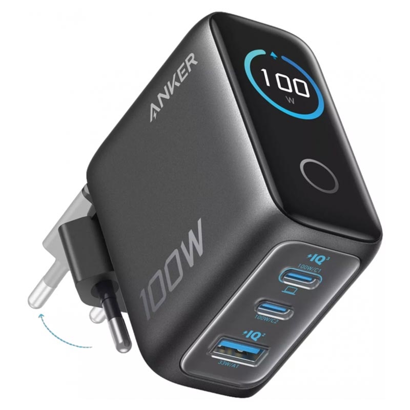 Încărcător de perete Anker GaN de 100W cu afișaj inteligent și cablu USB-C - încărcător rapid cu 2 porturi USB-C și USB-A