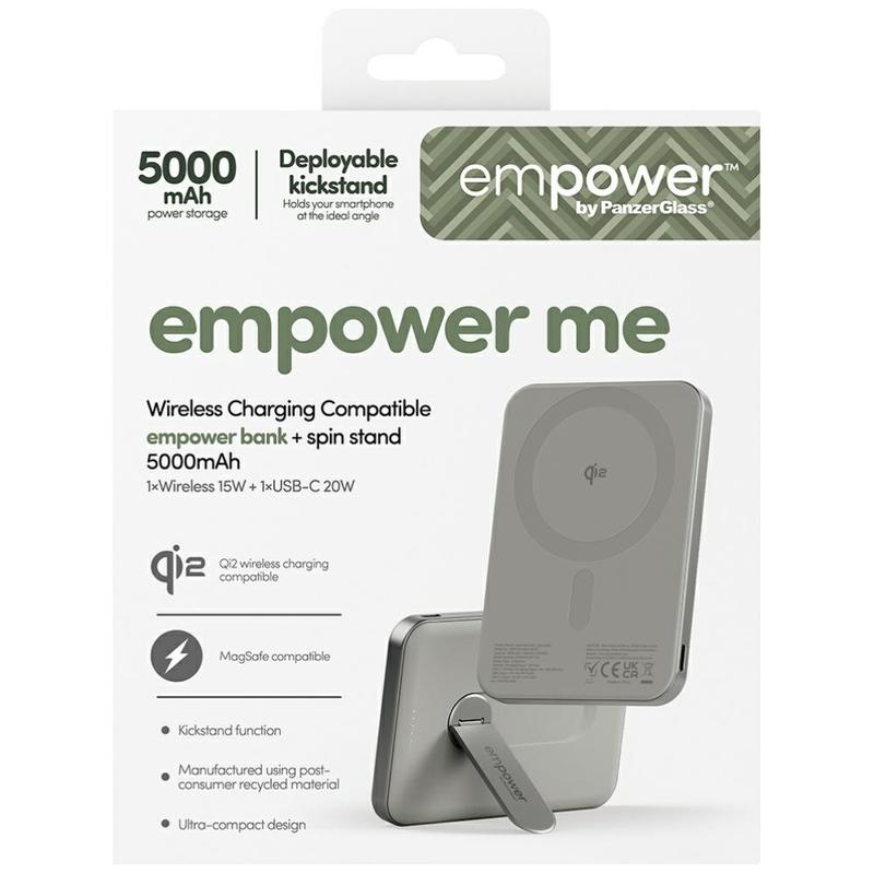 Empower by PanzerGlass Empower Bank cu suport rotativ este o baterie externă compactă și durabilă, concepută pentru încărcare rapidă și fiabilă oriunde te-ai afla. Compatibilă cu Qi2 și MagSafe, aceasta oferă aliniere magnetică sigură pentru încărcare wireless eficientă pe seria iPhone 12-16 și alte dispozitive compatibile cu Qi. Cu un profil subțire, suport rotativ încorporat și materiale durabile, este concepută pentru confortul zilnic și utilizare pe termen lung.