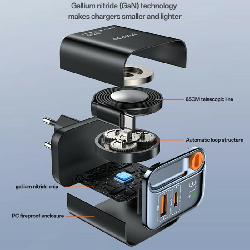 Yesido YC100 67W încărcător rapid cu cablu tip C retractabil - USB-A și USB-C GaN Adaptor de încărcare - EU Plug
