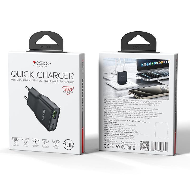 YESIDO YC112 Încărcător rapid cu două porturi de 20W - Adaptor de perete ultra-subțire USB-C / USB-A, PD și QC, priză UE
