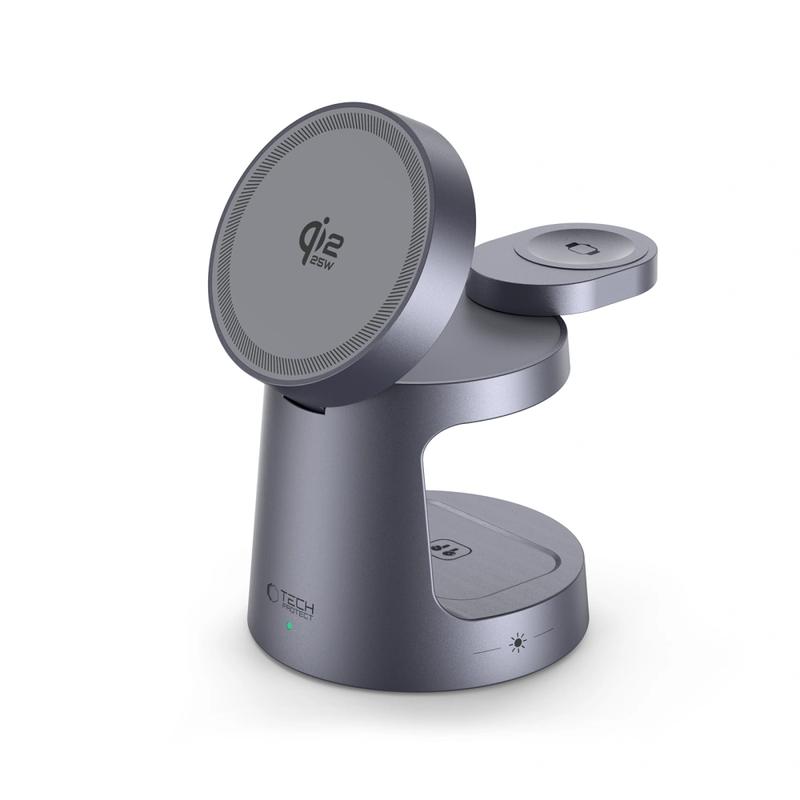 TECH-PROTECT QI2.2-25W-A48 este o stație de încărcare wireless magnetică 3-în-1 premium, concepută pentru a alimenta simultan smartphone-ul, ceasul inteligent și căștile wireless. Folosind tehnologia MagSafe împreună cu standardul de încărcare Qi/Qi2, aceasta oferă o încărcare rapidă, stabilă și fără cabluri într-o singură configurație elegantă. Cu un panou ajustabil pentru telefon, o construcție pliabilă și iluminare ambientală integrată, este o soluție ideală de încărcare pentru birou, noptieră sau spațiul de lucru.