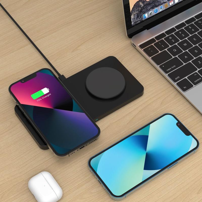 Simplificați încărcarea zilnică cu încărcătorul wireless magnetic de birou 2-în-1 M15. Conceput pentru a fi amplasat pe un birou sau noptieră, acesta vă permite să încărcați simultan un telefon și căști wireless. Alinierea magnetică ajută la menținerea poziției corecte a telefoanelor compatibile pentru o încărcare mai stabilă, în timp ce baza întărită cu silicon adaugă aderență pentru a preveni alunecarea și protejează suprafețele de zgârieturi.