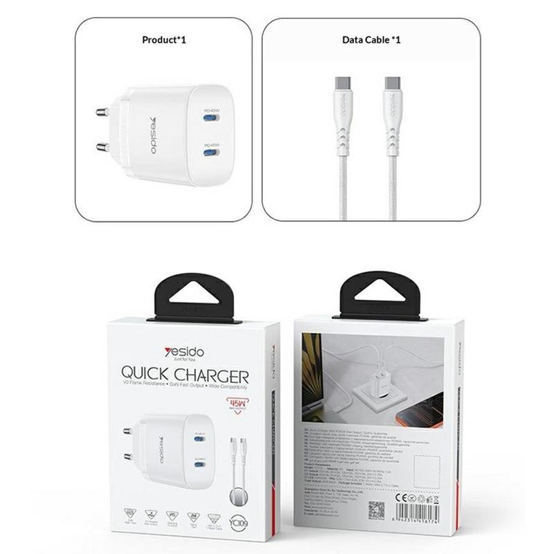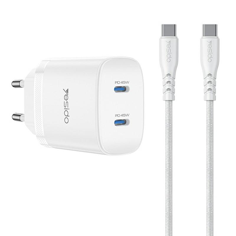 Încărcător Yesido YC109 45W Dual USB-C PD cu cablu USB-C - Adaptor de perete pentru încărcare rapidă