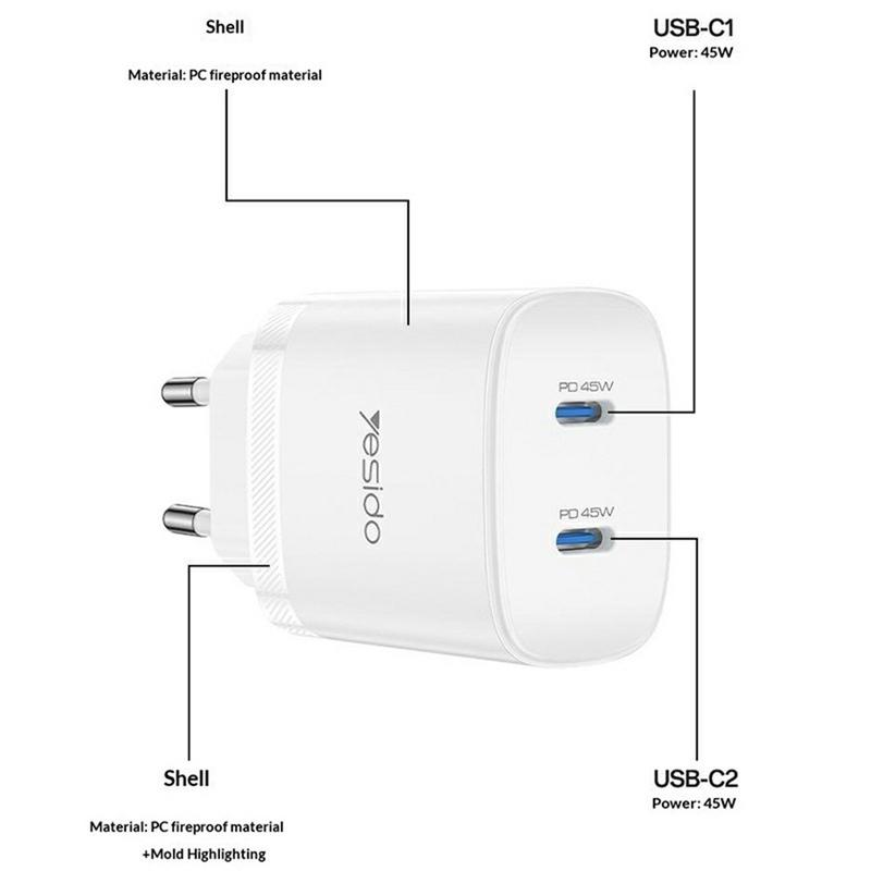 Alimentați două dispozitive simultan cu setul de încărcătoare Yesido YC109 45W dual USB-C PD, conceput pentru încărcare rapidă și eficientă acasă, la serviciu sau în geanta de călătorie. Cu o putere maximă de 45W și suport modern PPS (Programmable Power Supply), acesta poate oferi încărcare optimizată pentru smartphone-uri, tablete și alte dispozitive USB-C compatibile, contribuind la accelerarea reîncărcării și gestionând inteligent energia. Cele două porturi USB-C vă permit să încărcați simultan mai multe dispozitive, iar cablul USB-C la USB-C inclus înseamnă că sunteți gata de plecare imediat ce scoateți încărcătorul din cutie. Adaptorul compact de perete acceptă o intrare de 100-240 V c.a., ceea ce îl face o alegere practică pentru cei care călătoresc frecvent, iar carcasa rezistentă la foc vă oferă liniște sufletească în fiecare zi.