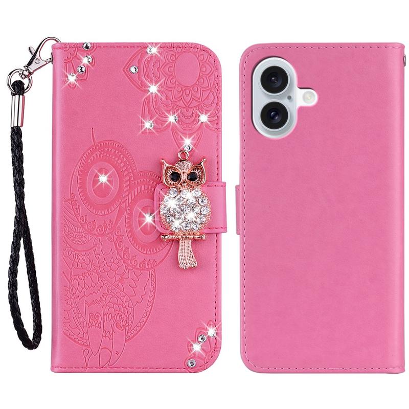 iPhone 16 Husa portofel cu strasuri bufniță - Roz Intens