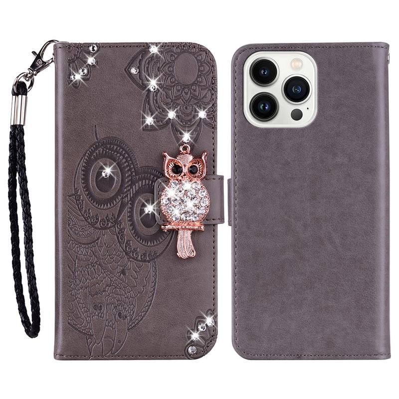 - Husă de portofel cu strasuri de bufniță pentru iPhone 16 Pro