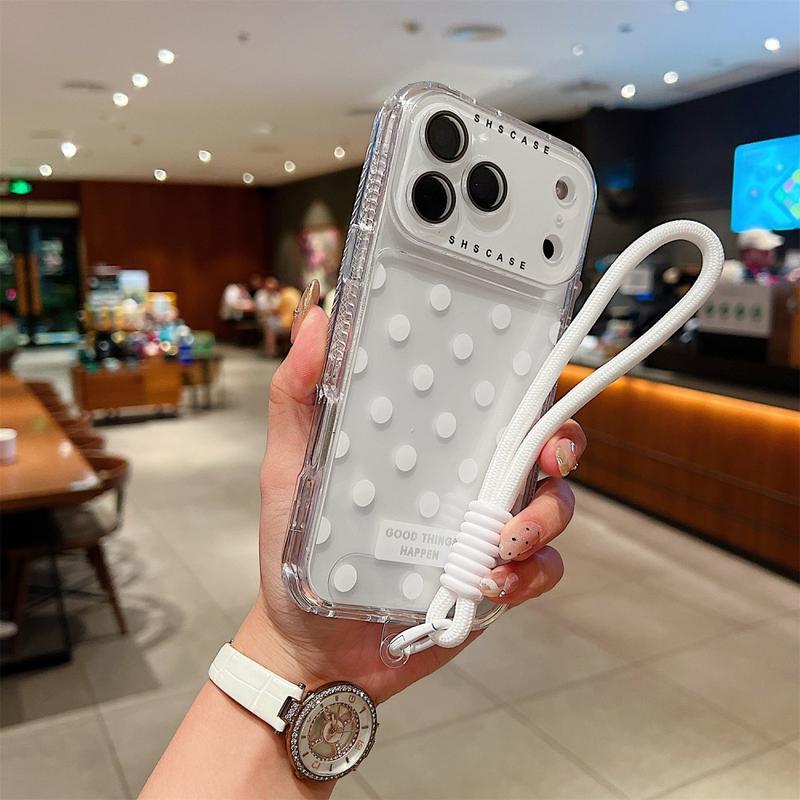 - Specificații - Material: TPU + PC | Compatibilitate: iPhone 17 Pro | Stil: Transparent cu buline | Accesorii: Husă + Film pentru lentile + Curea.