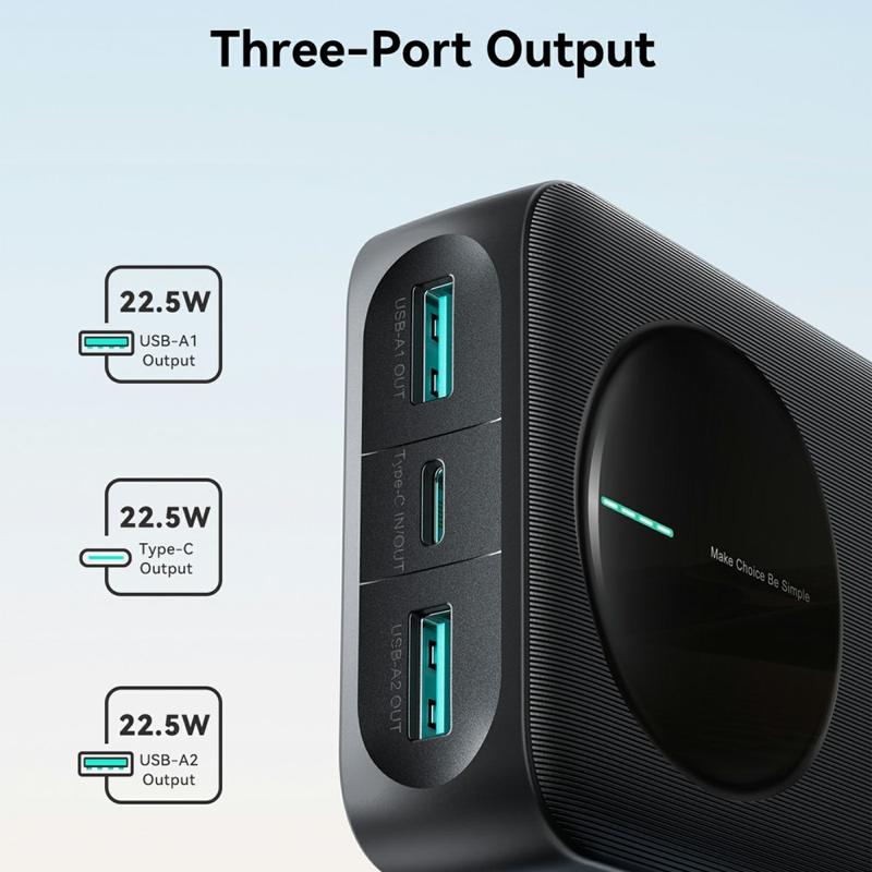 - 3 porturi de ieșire: 2× USB-A + 1× USB-C pentru încărcarea simultană a până la trei dispozitive