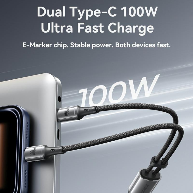 Încărcați două dispozitive USB-C în același timp cu cablul JOYROOM S-A57 USB-C la USB-C dublu. Construit pentru laptopuri, tablete și smartphone-uri moderne, acesta suportă o încărcare rapidă de până la 100 W și utilizează un cip de gestionare inteligentă E-Marker pentru a ajuta la furnizarea unei alimentări stabile pentru dispozitivele compatibile. De asemenea, obțineți un transfer de date de 480 Mbps pentru sincronizarea zilnică, astfel încât un singur cablu acoperă atât încărcarea, cât și transferurile de fișiere. Construcția durabilă din nailon împletit cu 48 de fire este concepută pentru a rezista la abraziune și la îndoirea zilnică, în timp ce cravata de organizare a cablului inclusă vă menține configurația ordonată la birou sau în geantă. Cu caracteristici de durabilitate testate, cum ar fi peste 10.000 de inserții și o capacitate de încărcare de 7 kg, este făcut pentru utilizare frecventă.