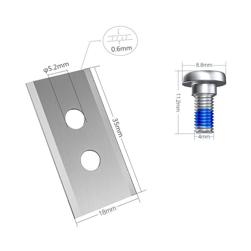 Cu dimensiuni precise de 35 x 18 x 0,75 mm și un design de montare cu două orificii, lamele sunt concepute pentru o fixare sigură și o funcționare stabilă pe mașinile de tuns iarba robotizate compatibile. Setul include, de asemenea, șuruburi potrivite cu compus albastru de blocare a filetului pentru a preveni slăbirea în timpul utilizării, făcând întreținerea mai ușoară și mai fiabilă.