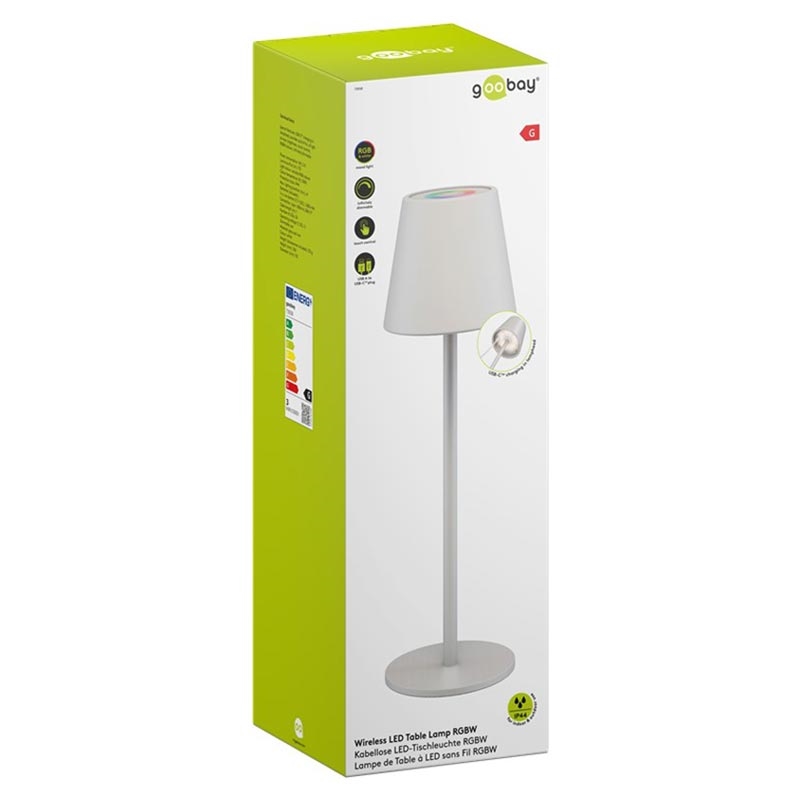 Lampa de masă LED fără fir Goobay RGBW - Control tactil, alb cald 3000 K + culori RGB, intensitate reglabilă în mod continuu, reîncărcabilă prin USB-C, IP44