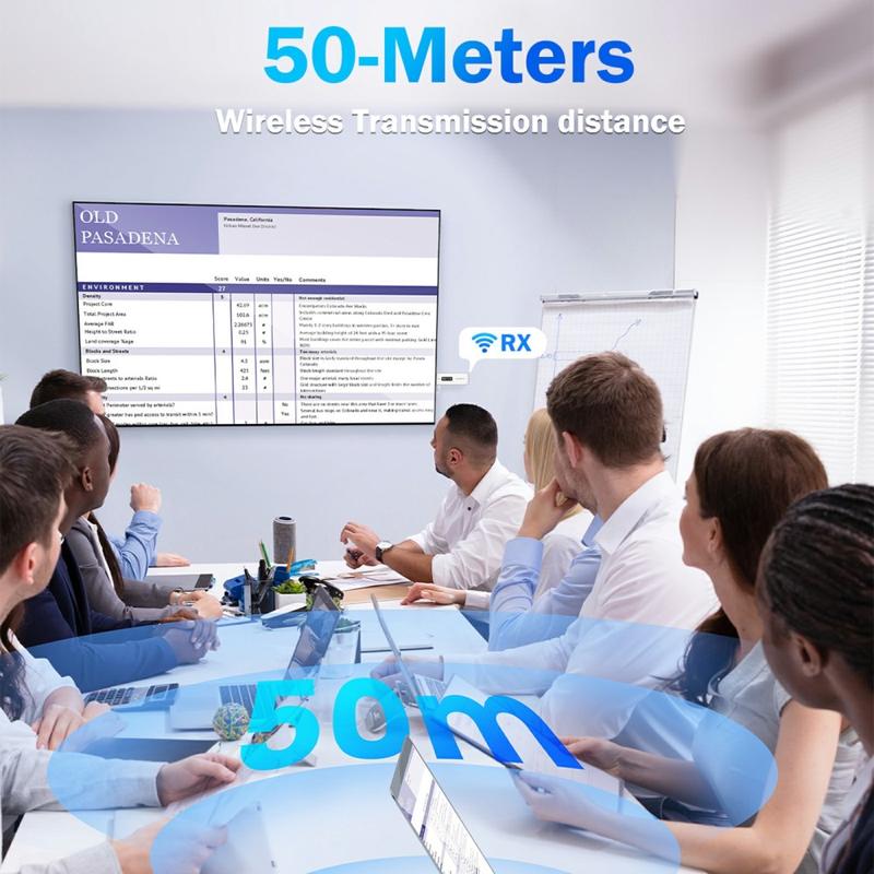 Sistemul suportă transmisie video de până la 1080P, asigurând o calitate clară a imaginii și performanțe fiabile pentru ecrane, proiectoare și monitoare. Este ideal pentru prezentări profesionale, redare video și screen mirroring.