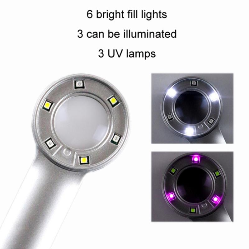 Lupa include 6 lumini de înaltă luminozitate: 3 lumini LED albe pentru iluminare clară și 3 lumini UV pentru nevoi speciale de inspecție. Comutatorul de tip push permite comutarea ușoară între lumina albă și lumina UV violet, adaptându-se la diferite scenarii de vizualizare.