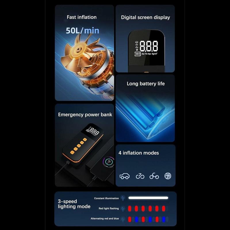 Spre deosebire de compresoarele de aer tradiționale voluminoase, acest umflator digital wireless este ușor, portabil și simplu de utilizat. Afișajul său inteligent, modurile presetate și viteza puternică de umflare îl fac un companion practic pentru conducerea în siguranță și stilul de viață activ.