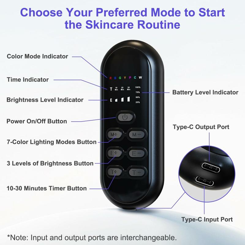 Această mască de terapie cu lumină LED utilizează 7 culori de lumină specifice - roșu, albastru, verde, galben, violet, cyan și alb - pentru a trata multiple probleme ale pielii, cum ar fi aspectul tern, tenul neuniform, petele și semnele îmbătrânirii. Fiecare lungime de undă este concepută pentru a susține un aspect mai sănătos al pielii prin tratament delicat, neinvaziv.