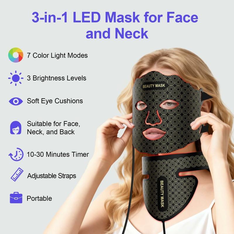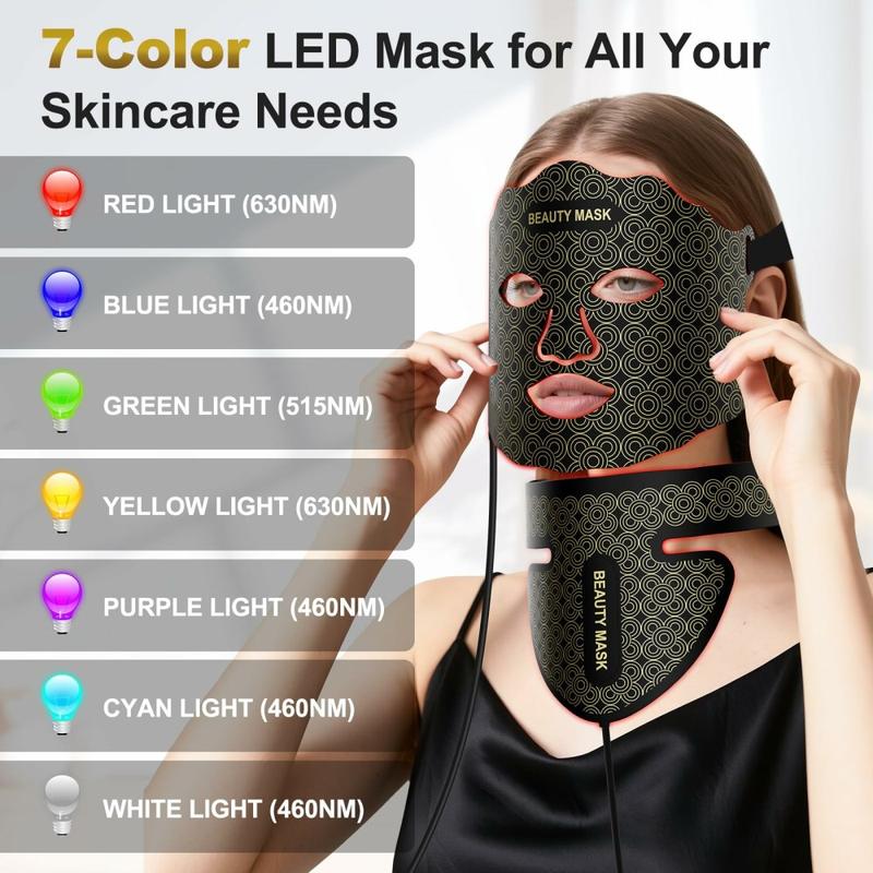 Mască de înfrumusețare cu terapie cu lumină LED în 7 culori – Dispozitiv de întinerire a pielii feței și gâtului cu 3 niveluri de intensitate