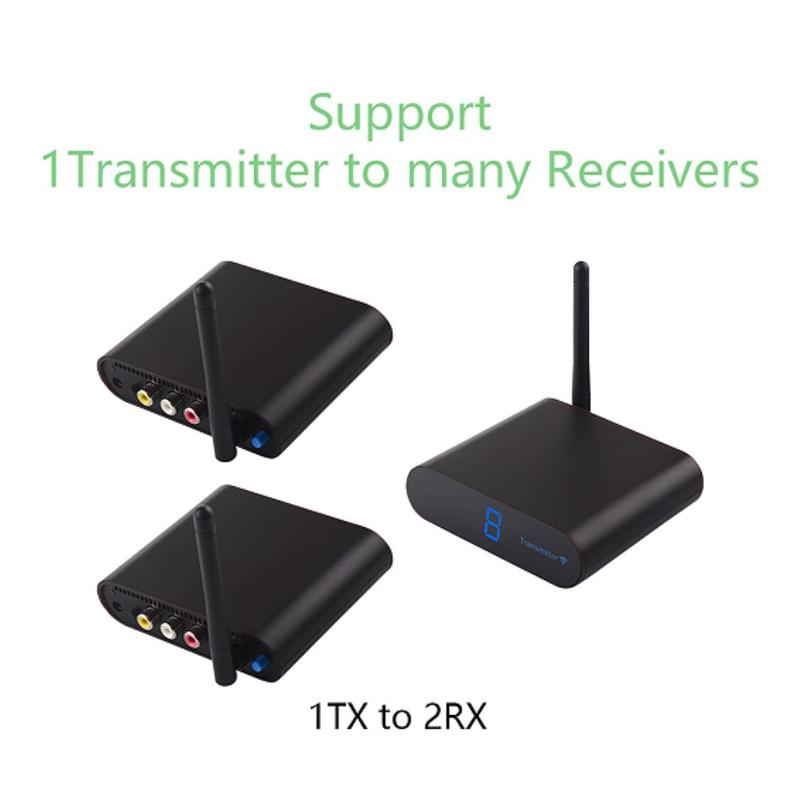 - O ieșire la două - Un transmițător suportă două receptoare pentru redarea simultană pe mai multe ecrane.