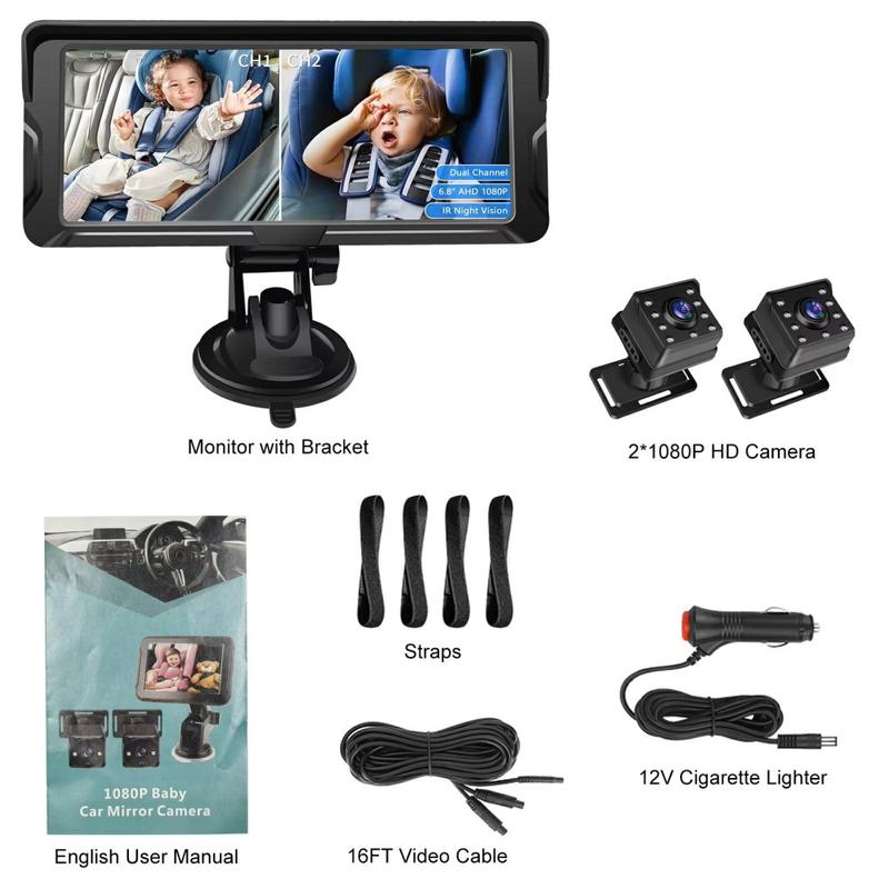 Monitor auto pentru copii de 6,8 inci - două camere HD 1080P cu rotație 360, vedere în unghi larg și vedere nocturnă cu infraroșu