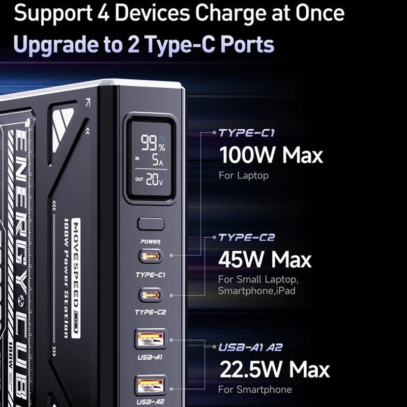 - Ieșire de încărcare rapidă de 100 W - Suportă protocoalele de încărcare rapidă PD 100 W și 22,5 W, oferind viteze de încărcare la nivel de laptop pentru mai multe dispozitive simultan.