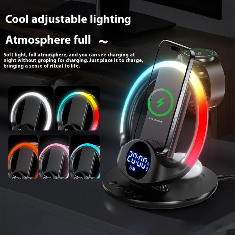 Mai mult decât un simplu încărcător - funcționează și ca ceas digital și suport pentru telefon. Alegeți din cinci moduri de iluminare ambientală cu LED (alb, alb roz, roșu, albastru gheață, culoare fantezie) pentru a vă potrivi cu starea de spirit sau decorul.