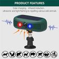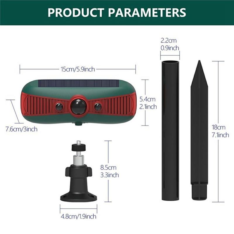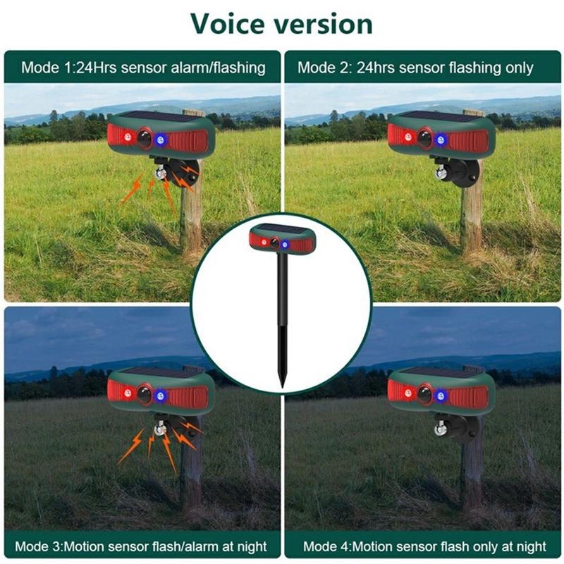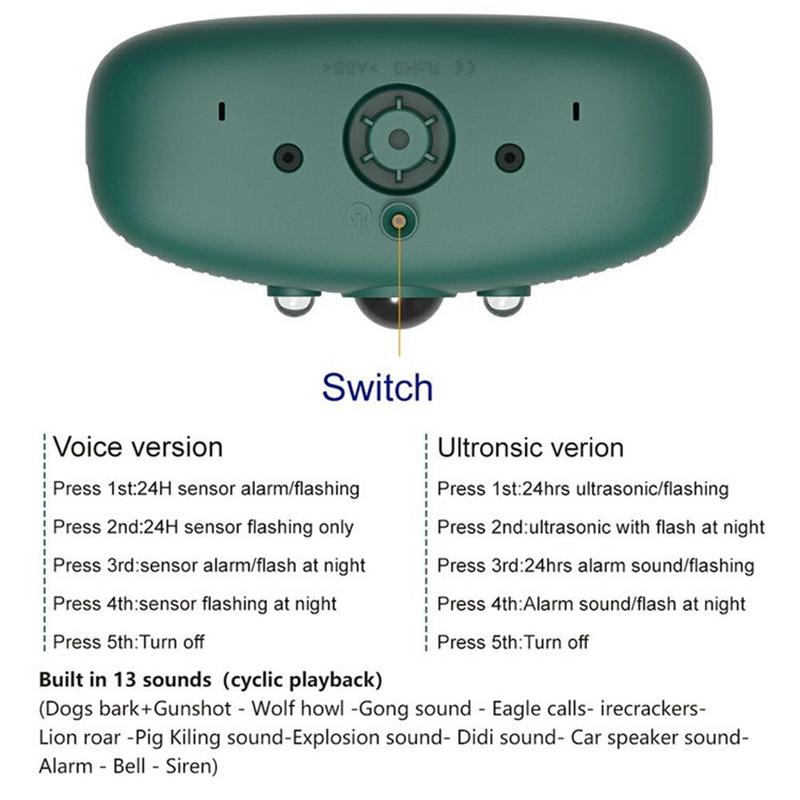 Acest dispozitiv dispune de 12 efecte sonore rotative, inclusiv sirene, lătrături de câine și zgomote tip împușcătură, oferind o soluție de descurajare versatilă pentru a ține animalele și dăunătorii departe de proprietatea dvs.