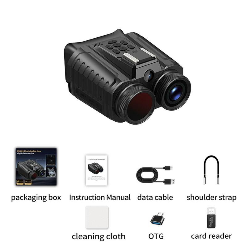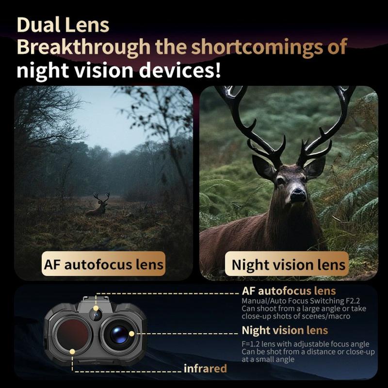 NV109 Binoclu pentru vedere pe timp de noapte cu obiectiv dublu, înregistrare video 2.7K, fotografii de 64 MP și card de 32 GB - cameră de vânătoare în aer liber cu ecran IPS de 2,0"