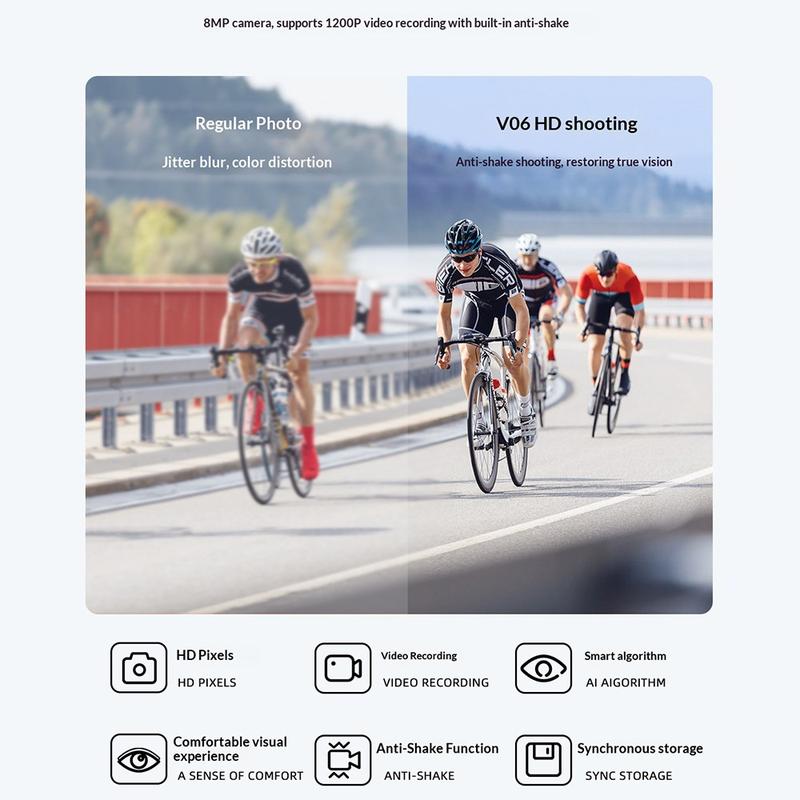 Ochelarii inteligenți V06 AI utilizează tehnologii avansate de îmbunătățire a imaginii pentru a optimiza înregistrările în condiții reale. Funcții precum luminozitatea în condiții de iluminare slabă, estomparea fundalului și reducerea zgomotului multi-cadru contribuie la obținerea unor imagini mai clare și mai echilibrate, ideale pentru activități în aer liber și momente cotidiene.