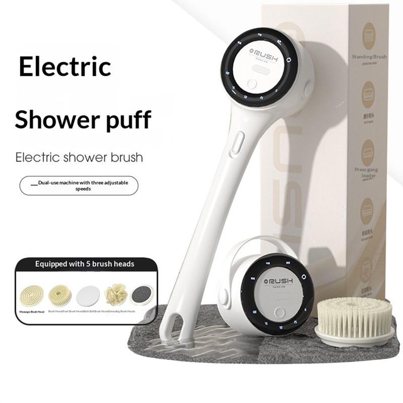 Perie electrică de duș A8 cu afișaj LED - Perie pentru spate cu mâner lung și 3 viteze, cu 5 capete de perie