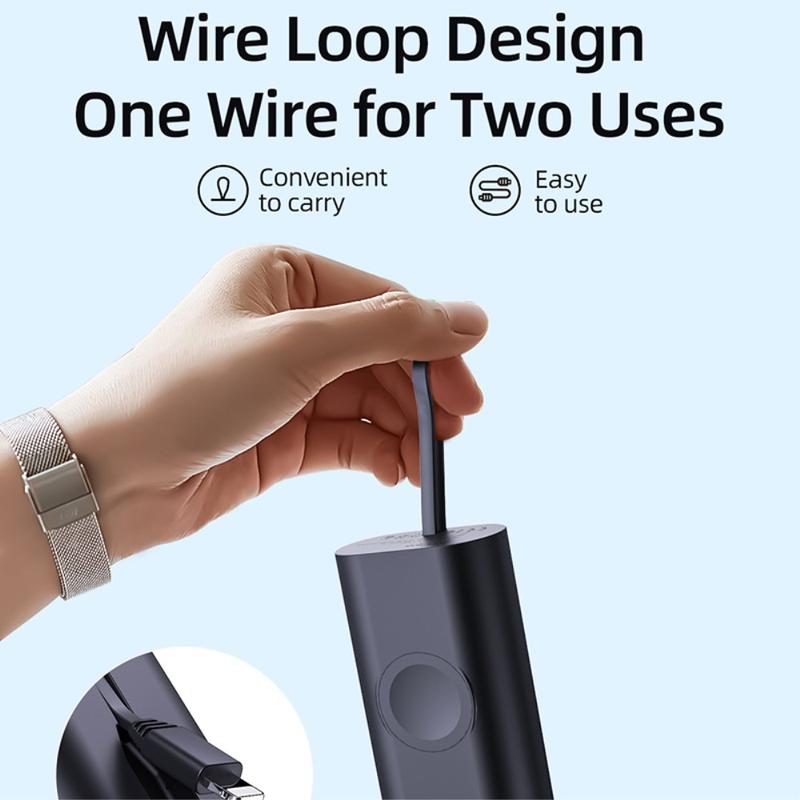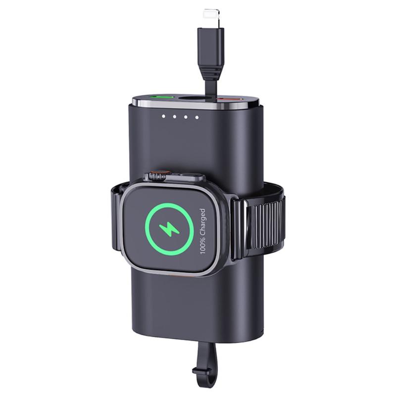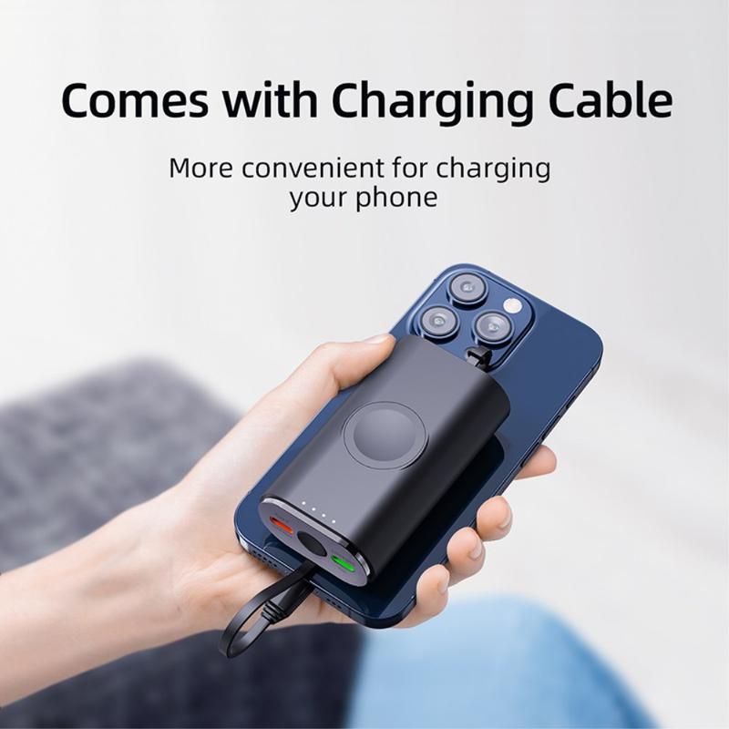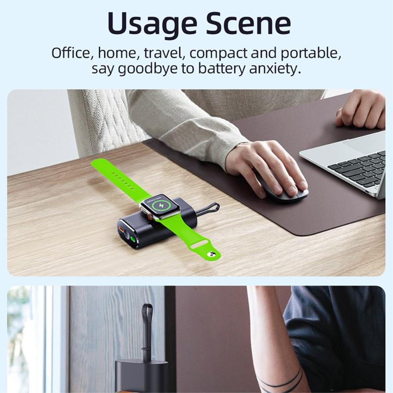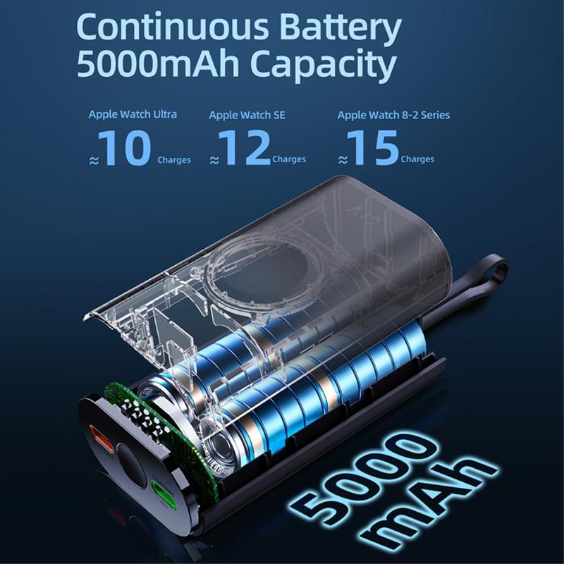 Capacitatea sa de 5000mAh îl face o sursă de alimentare de rezervă utilă pentru călătorii, naveta, zilele de lucru și transportul zilnic. Zona de încărcare magnetică încorporată ajută la menținerea Apple Watch-ului aliniat în timpul încărcării, în timp ce cablul inclus și designul compact și ușor îl fac ușor de păstrat într-o geantă, buzunar sau pe birou.