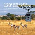 - Raza de detecție largă de 120° - Trei senzori PIR acoperă un câmp vizual larg, detectând în mod eficient mișcarea animalelor în zone exterioare mari.