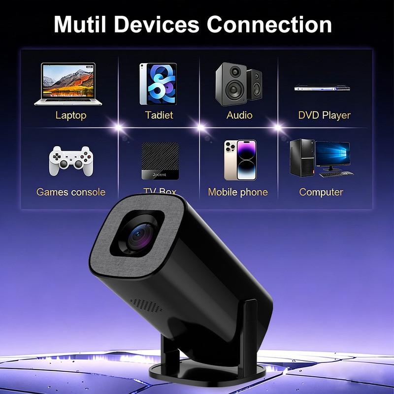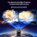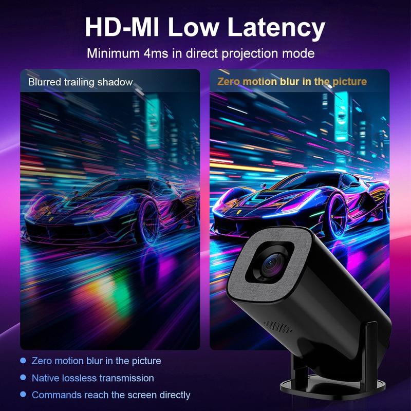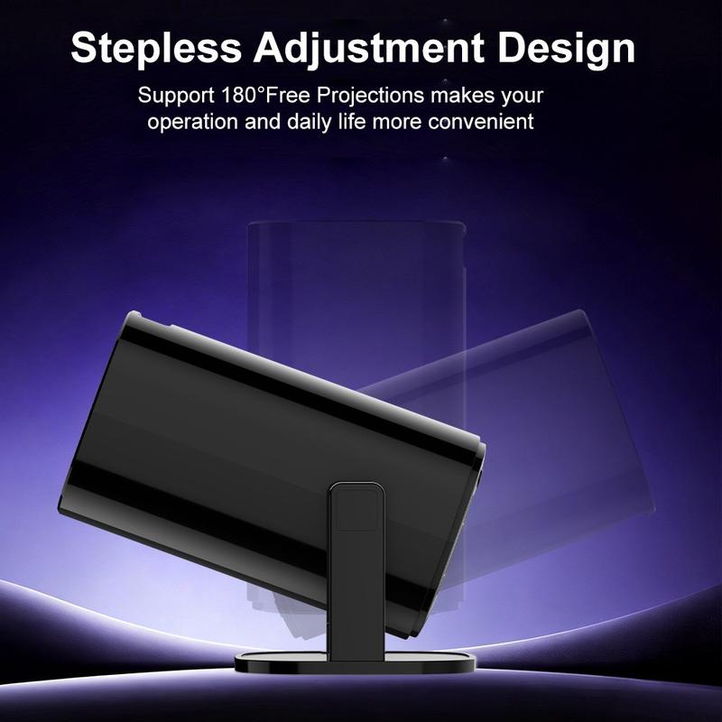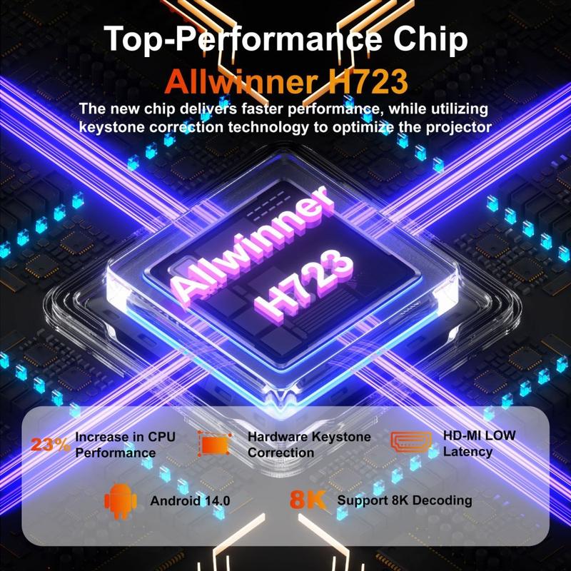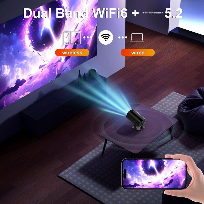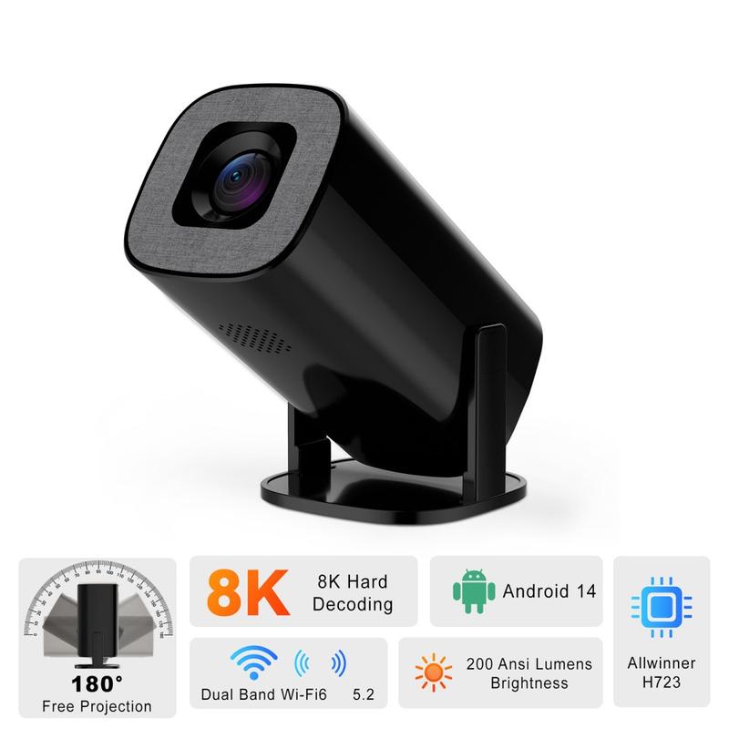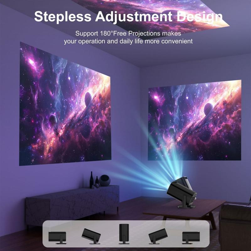 Proiector portabil Android 14 V1 (200 ANSI) - rezoluție nativă 720p, corecție automată a distorsiunii trapezoidale, înclinare 180°, WiFi 6 dual-band și Bluetooth 5.2, 1 GB/8 GB